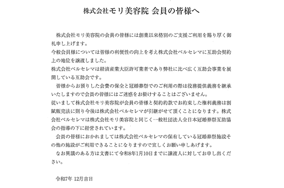 お知らせ ㈱モリ美容院(黒部市)より会員譲渡 掲載日:2025.12.1 ㈱モリ美容院(黒部市)より会員譲渡 新ホール「シティホール呉羽」がオープンしました 掲載日:2025.11.11 新ホール「シティホール呉羽」がオープンしました 新ホール「家族葬ホール桂町」がオープンしました 掲載日:2025.9.22